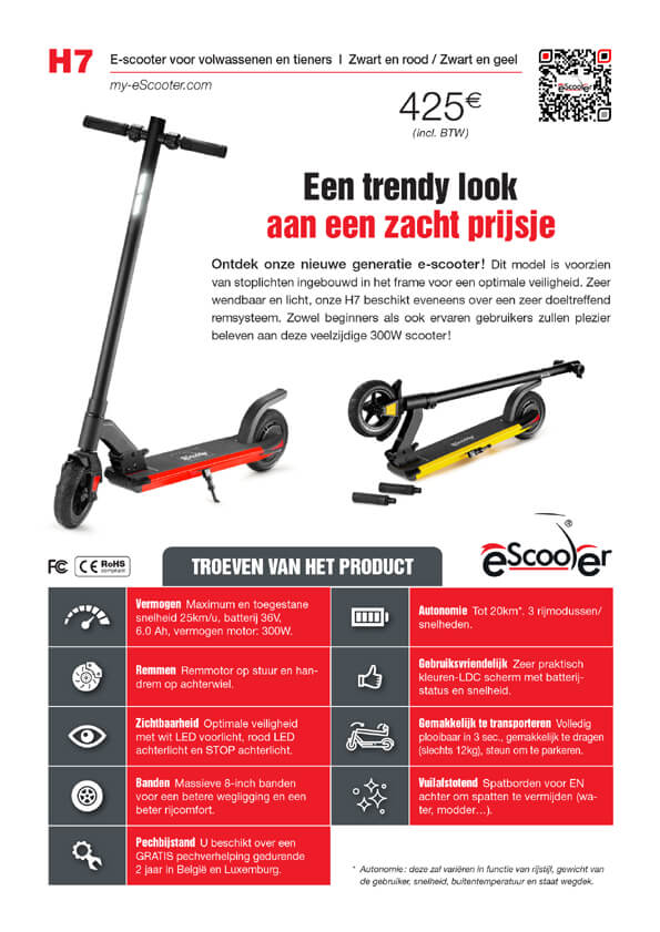 Dit model is voorzien van stoplichten ingebouwd in het frame voor een optimale veiligheid. Zeer wendbaar en licht, onze H7 beschikt eveneens over een zeer doeltreffend remsysteem.